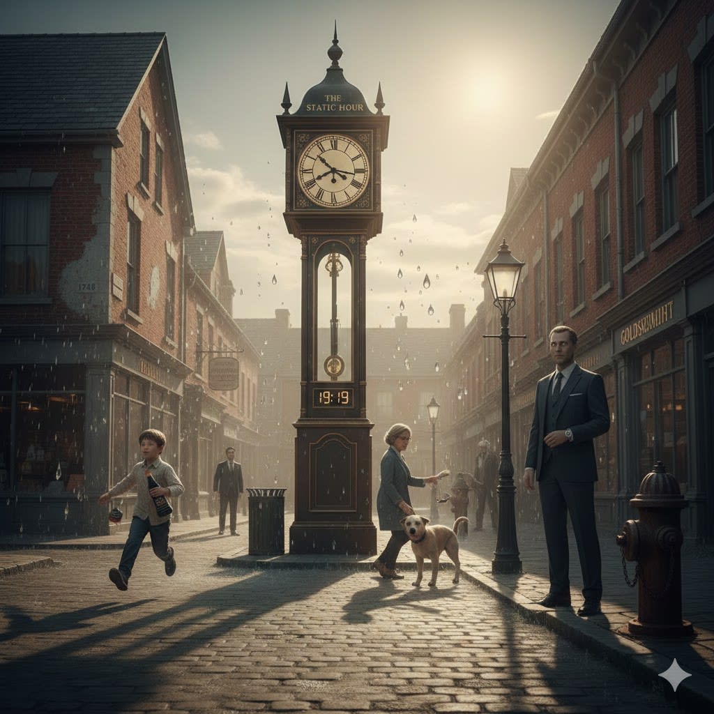 Rain dripped from the worn eaves, hitting the rusted iron door with a regular, muffled clang, like a silent countdown waiting for some forgotten signal to sound.