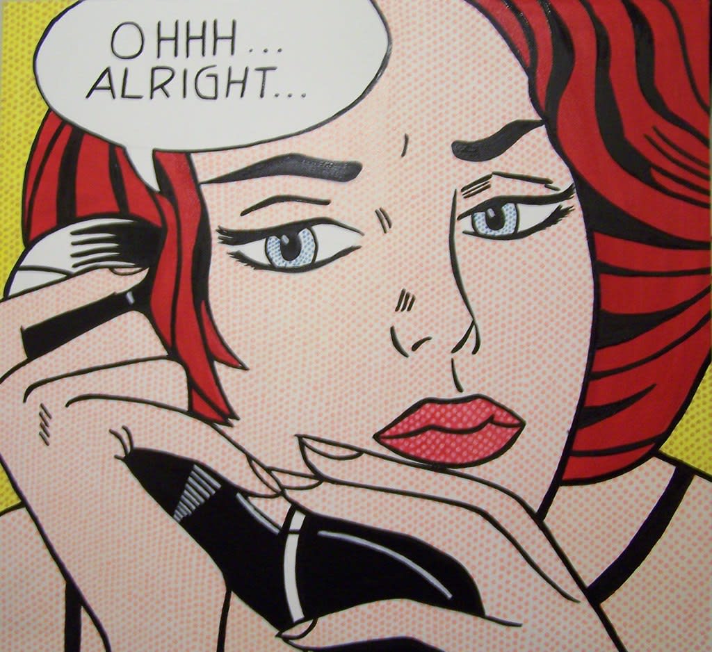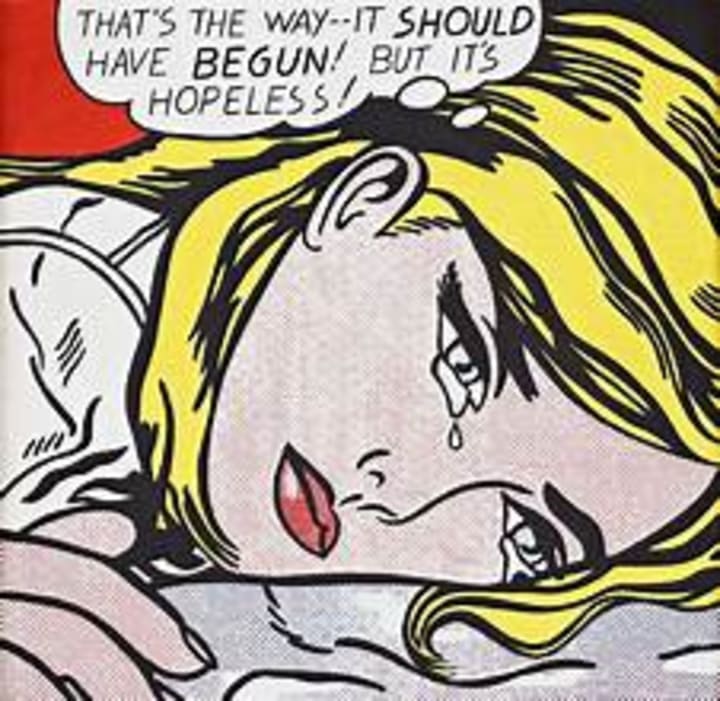 Another famous artwork, Hopeless, is the artist’s exploration of comic book melodrama and romance. The painting depicts a distressed woman, face turned upward, with a tearful expression. The artist uses primary colors, Ben Day dots, and thick outlines. The speech bubble reads, “That’s the way—it should have begun! But it’s hopeless!”