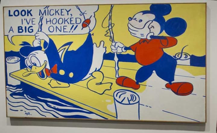 A painting created in 1961, Look Mickey depicts Disney characters Mickey Mouse and Donald Duck in a fishing mishap. The artwork makes significant alterations to the original color source. It can be viewed at the National Gallery of Art in Washington, D.C.