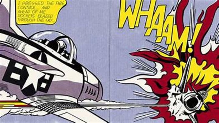 Created in 1963, Whaam! It is a diptych painting. This artwork depicts a fighter plane that fires a rocket hitting a second plane that explodes in flames. It can be viewed at the Tate Museum in London.