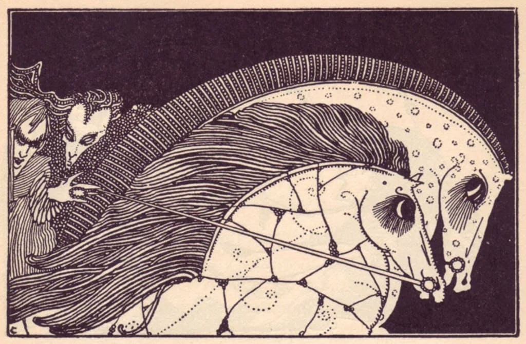 "Faust and Mephistopheles gallop forward into the unknown" from "Faust" by Goethe by Harry Clarke, 1925.