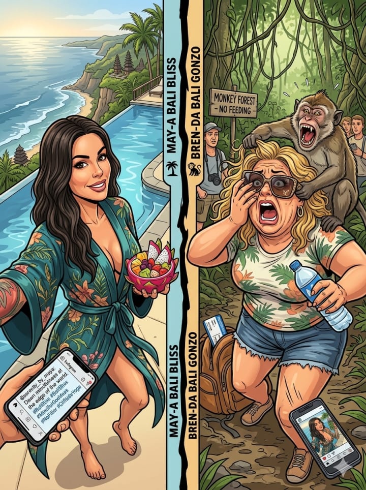 Brenda’s "Bali Experience" was a gonzo nightmare from the jump. While Maya’s feed showed serene yoga sessions at dawn, Brenda spent her first morning in Ubud trapped in a violent negotiation with a macaque monkey that had stolen her knock-off designer sunglasses.