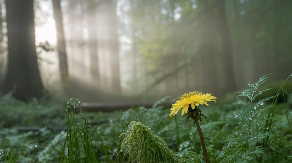 The dandelion stands out as a quiet focal point. Often dismissed as a weed, it is here elevated to something luminous: “A sun on earth.” Its yellow contrasts with the surrounding “white fog,” creating a moment of clarity and warmth within the muted palette. The raindrop weighing it down does not destroy it; instead, it creates tension, a trembling that speaks to fragility and resilience simultaneously. This image encapsulates the poem’s central theme: even under the weight of sorrow, there can be beauty, even light.