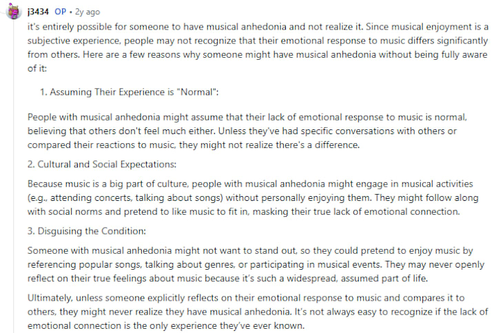 I recently learned this when I fell down a research rabbit hole online, and it made a lot of things click for me about the way I feel about music. Personally, I've never fully understood what everyone around me was experiencing when listening to music.