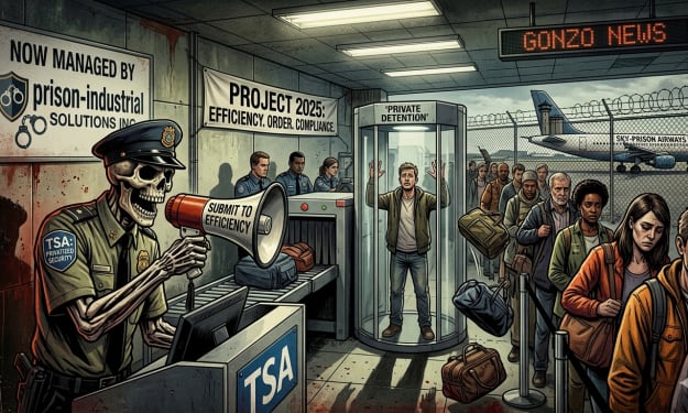 LOS ANGELES, CALIFORNIA — I am standing in a security line at Los Angeles International Airport, staring into the dead, glazed eyes of a man who has been screaming "LAPTOPS OUT" for six straight hours. Currently, he is a federal employee. He has a pension. He has health insurance. But if the ghouls behind Project 2025 have their way, this man is about to be "liberated". By liberated, I mean he’s about to be fired, stripped of his union card, and rehired at $18.00 an hour by a subsidiary of a private equity firm that also manages an "enhanced detention center" in the Mojave Desert, that's conveniently housing all the dangerous undocumented immigrants, and keeping "America Safe"... again.