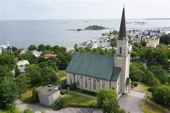 Hanko Church sits right in the center near the water tower. The current church was built in the 1950s after World War II and is a striking Lutheran landmark.